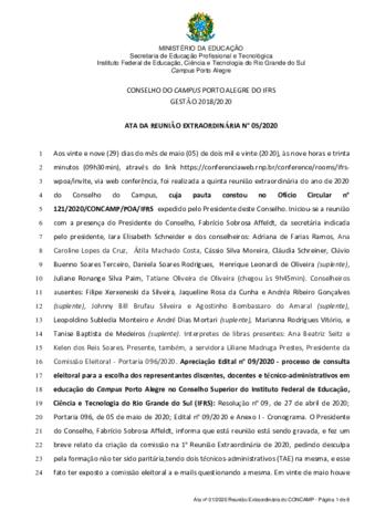 Ata da quinta reunião extraordinária, realizada em 29 de maio de 2020.