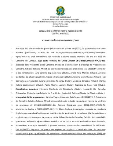 Ata da sétima reunião ordinária do Conselho do Campus Porto Alegre, realizada em 09 de agosto de 2021.