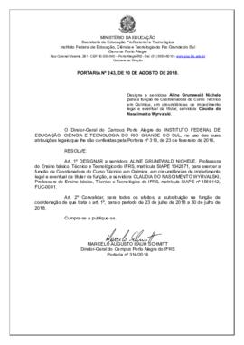 Sem títuloDesigna Aline Grunewald Nichele para a função de Coordenadora do Curso Técnico em Química, em circunstâncias de impedimento legal e eventual da titular.