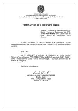 Direção GeralDesigna o professor de Magistério do Ensino Básico, Técnico e Tecnológico do IFRS, André Rosa Martins, como Coordenador do Curso Técnico em Panificação, deste Campus.