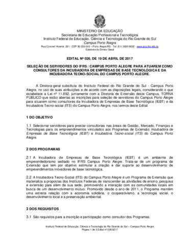 SELEÇÃO DE SERVIDORES DO IFRS / CAMPUS PORTO ALEGRE PARA ATUAREM COMO CONSULTORES DA INCUBADORA DE EMPRESAS DE BASE TECNOLÓGICA E DA INCUBADORA TECNO-SOCIAL DO CAMPUS PORTO ALEGRE.