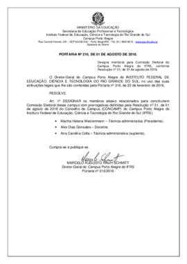 Direção GeralDesigna membros para Comissão Eleitoral do Campus Porto Alegre do IFRS, conforme Resolução nº 35, de 16 de agosto de 2018.