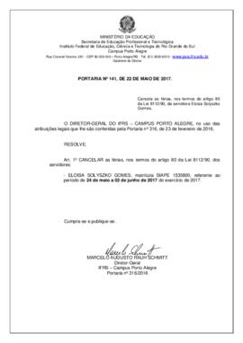 UntitledDesigna o servidor do IFRS, Anderson Rodrigues Corrêa como Diretor de Ensino deste Campus, em substituição ao professor de Magistério do Ensino Básico, Técnico e Tecnológico do IFRS, Fabio Yoshimitsu Okuyama, que estará em gozo de férias de 24 de julho a 28 de julho de 2017.