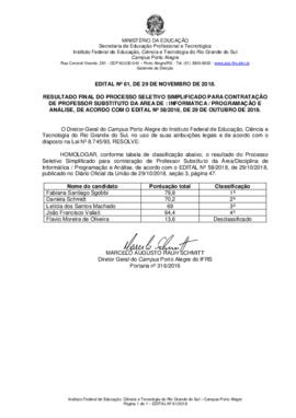 RESULTADO FINAL DO PROCESSO SELETIVO SIMPLIFICADO PARA CONTRATAÇÃO DE PROFESSOR SUBSTITUTO DA ÁREA DE : INFORMÁTICA / PROGRAMAÇÃO E ANÁLISE, DE ACORDO COM O EDITAL Nº 58/2018, DE 29 DE OUTUBRO DE 2018.