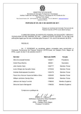UntitledDesigna os servidores do IFRS – Campus Porto Alegre para constituírem a Comissão Especial de Avaliação de Desempenho do Estágio Probatório da servidora Clarissa de Godoy Menezes.
