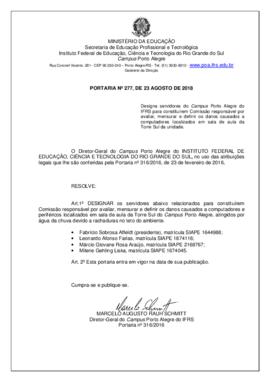 Sem títuloDesigna servidores do Campus Porto Alegre do IFRS para constituírem Comissão responsável por avaliar, mensurar e definir os danos causados a computadores localizados em sala de aula da Torre Sul da unidade.