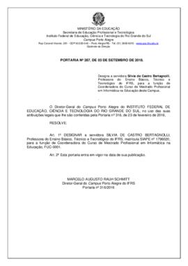 Sem títuloDesigna Silvia de Castro Bertagnolli para a função de Coordenadora do Curso de Mestrado Profissional em Informática na Educação.