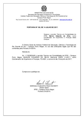 Designa o servidor Técnico em Contabilidade do IFRS, Marlon Eduardo da Silva, como Coordenador de Orçamento e Finanças deste