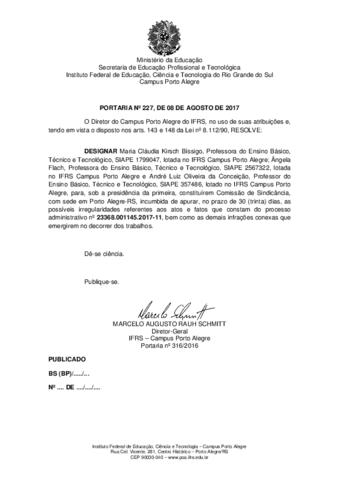 DESIGNAR Maria Cláudia Kirsch Bíssigo, Professora do Ensino Básico, Técnico e Tecnológico, SIAPE 1799047, lotada no IFRS Campus Porto Alegre; Ângela Flach, Professora do Ensino Básico, Técnico e Tecnológico, SIAPE 2567322, lotada no IFRS Campus Porto Alegre e André Luiz Oliveira da Conceição, Professor do Ensino Básico, Técnico e Tecnológico, SIAPE 357486, lotado no IFRS Campus Porto