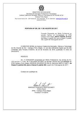 Sem títuloConcede Progressão por Mérito Profissional à (o) servidor (a) Químico do IFRS Campus Porto Alegre, Rafael Dutra Soares, da Classe E, padrão 405, para a Classe E, padrão 406, a partir de 03 de fevereiro de 2018.