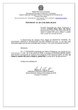 Sem títuloConcede Progressão por Mérito Profissional à servidora Fernanda Missio Mario das Neves, Nutricionista do Campus Porto Alegre do IFRS, da Classe E, padrão 405, para a Classe E, padrão 406, a contar de 01 de abril de 2018.
