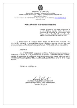 Sem títuloConcede Progressão por Mérito Profissional à servidora Assistente de Aluno do IFRS Campus Porto Alegre, Leticia Noal Tagliari, da Classe C, padrão 405, para a Classe C, padrão 406, a contar de 01 de março de 2018.