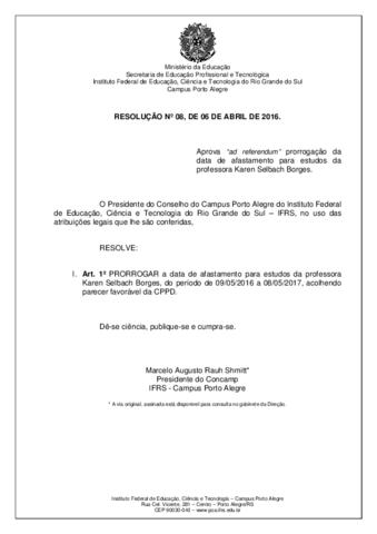 Aprova “ad referendum” prorrogação da data de afastamento para estudos da professora Karen Selbach Borges.